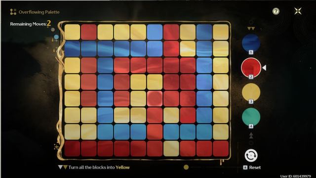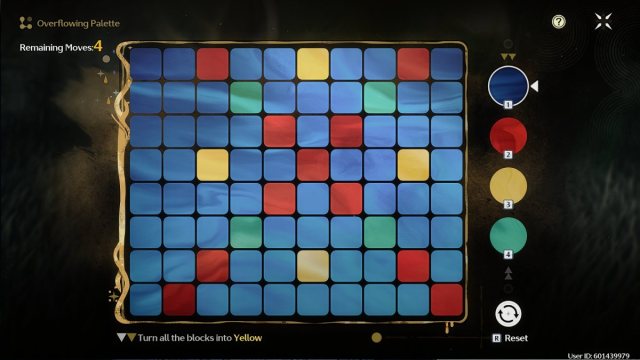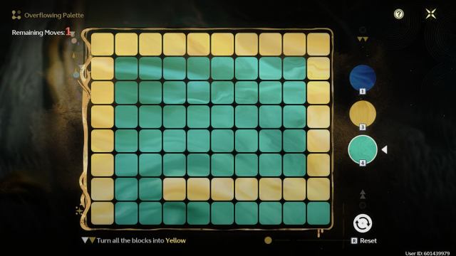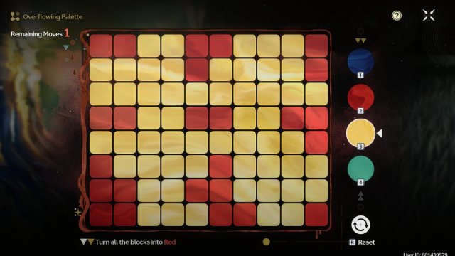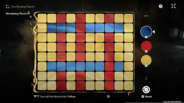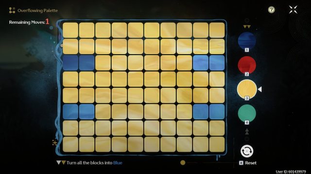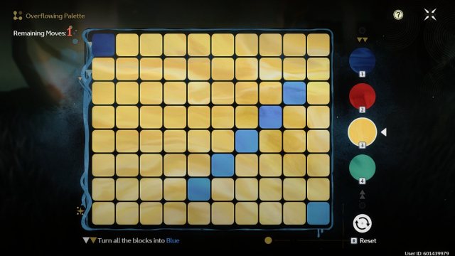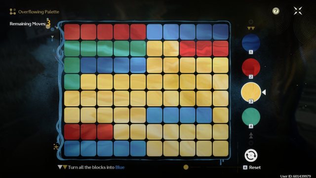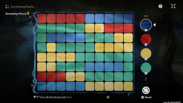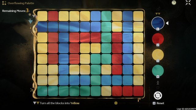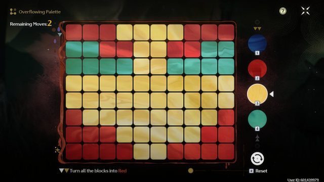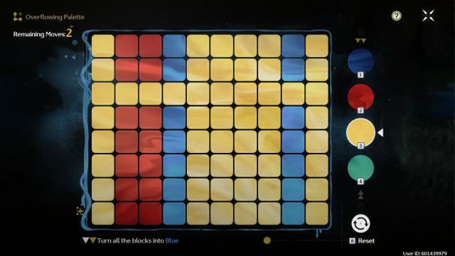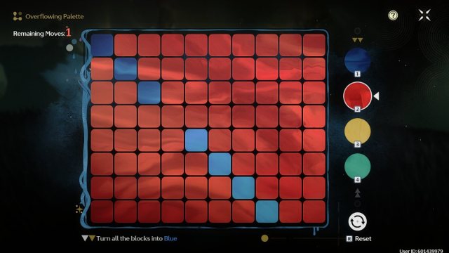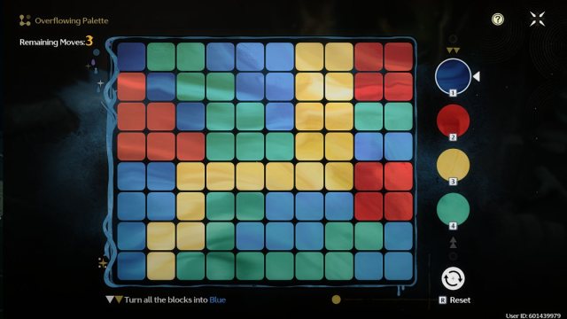 The Overflowing Palette puzzle requires you to change all colors on the palette to a specified color within a set number of turns. Completing Overflowing Palettes contributes to your exploration progress and unlocks more items for you to purchase at the unique Egla Town merchant, as you get 20 Resonant Calcite for each puzzle. If you reset the Overflowing Palette enough times, the game will lower the difficulty and give you more turns to solve it.