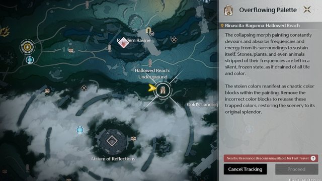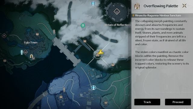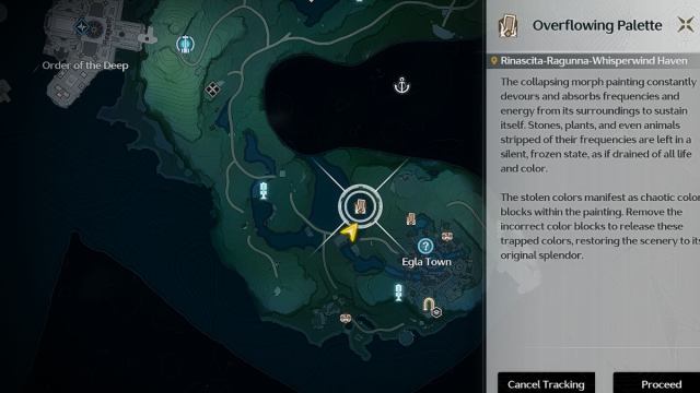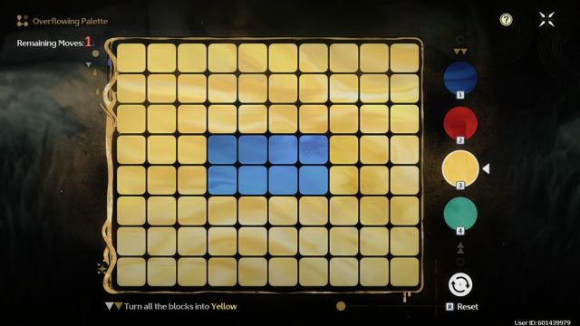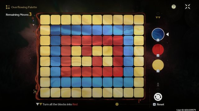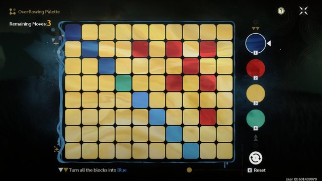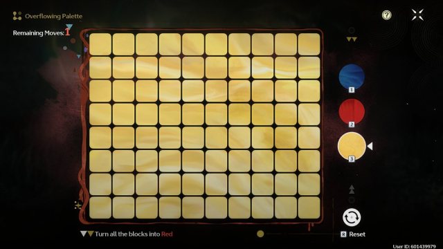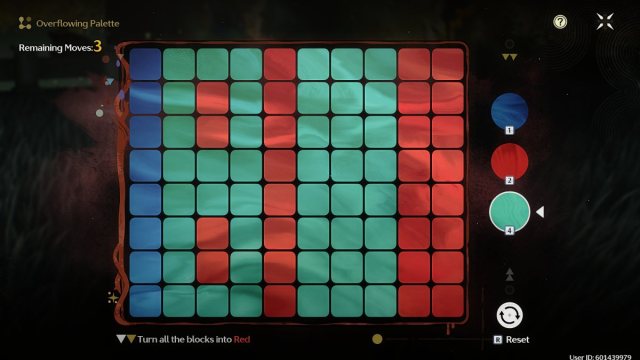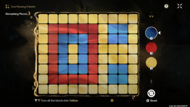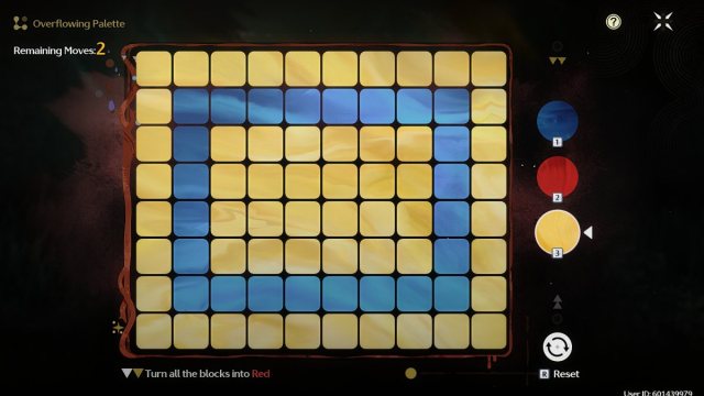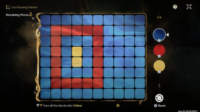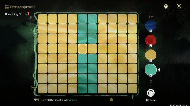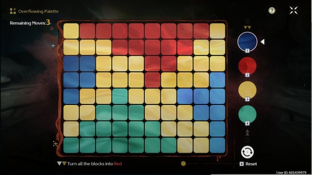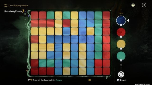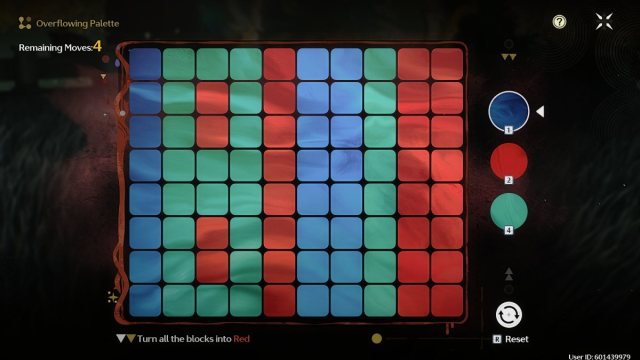 The Overflowing Palette puzzle requires you to change all colors on the palette to a specified color within a set number of turns. Completing Overflowing Palettes contributes to your exploration progress and unlocks more items for you to purchase at the unique Egla Town merchant, as you get 20 Resonant Calcite for each puzzle. If you reset the Overflowing Palette enough times, the game will lower the difficulty and give you more turns to solve it.